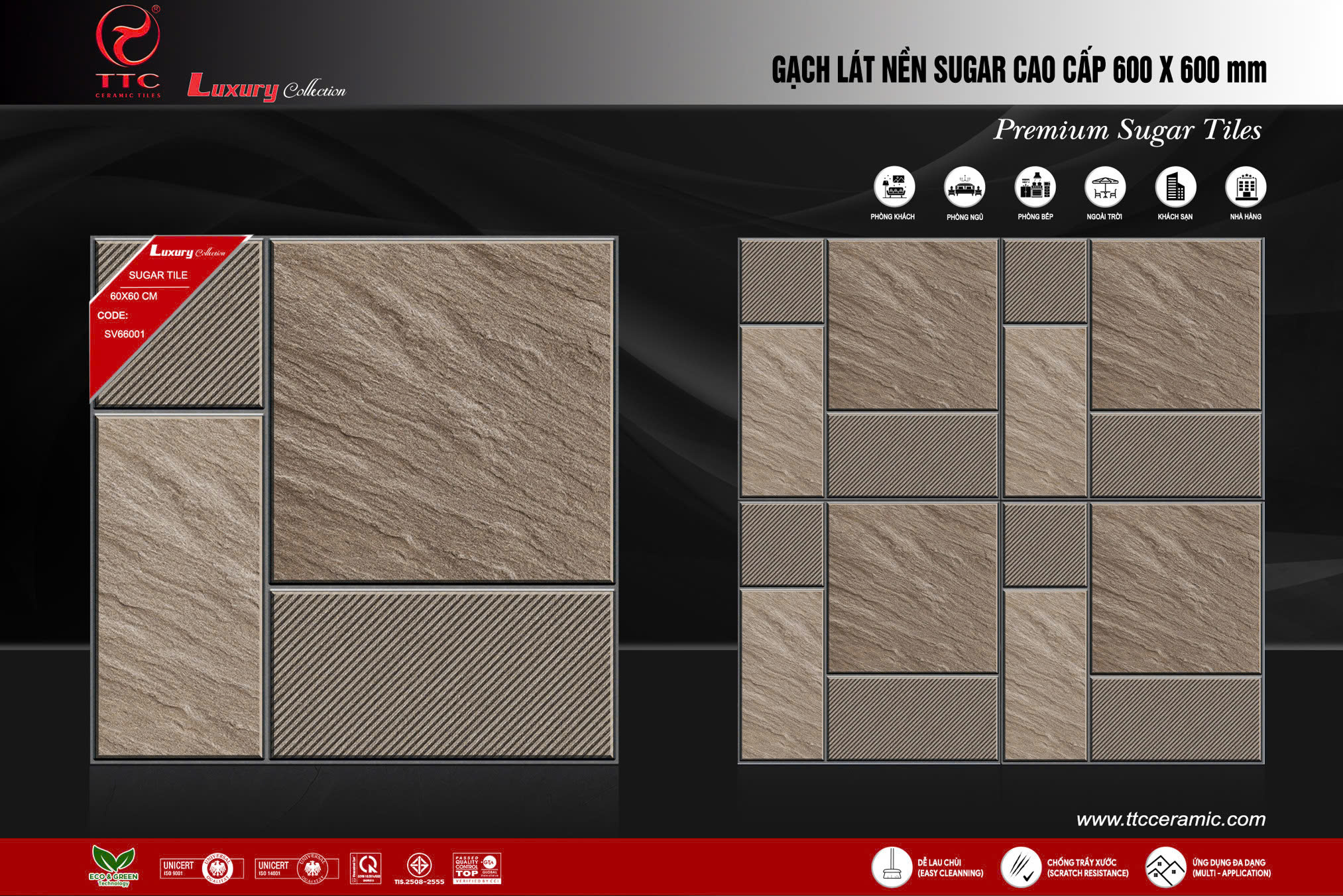 Kích thước 60×60 linh hoạt, phù hợp với nhiều diện tích thi công